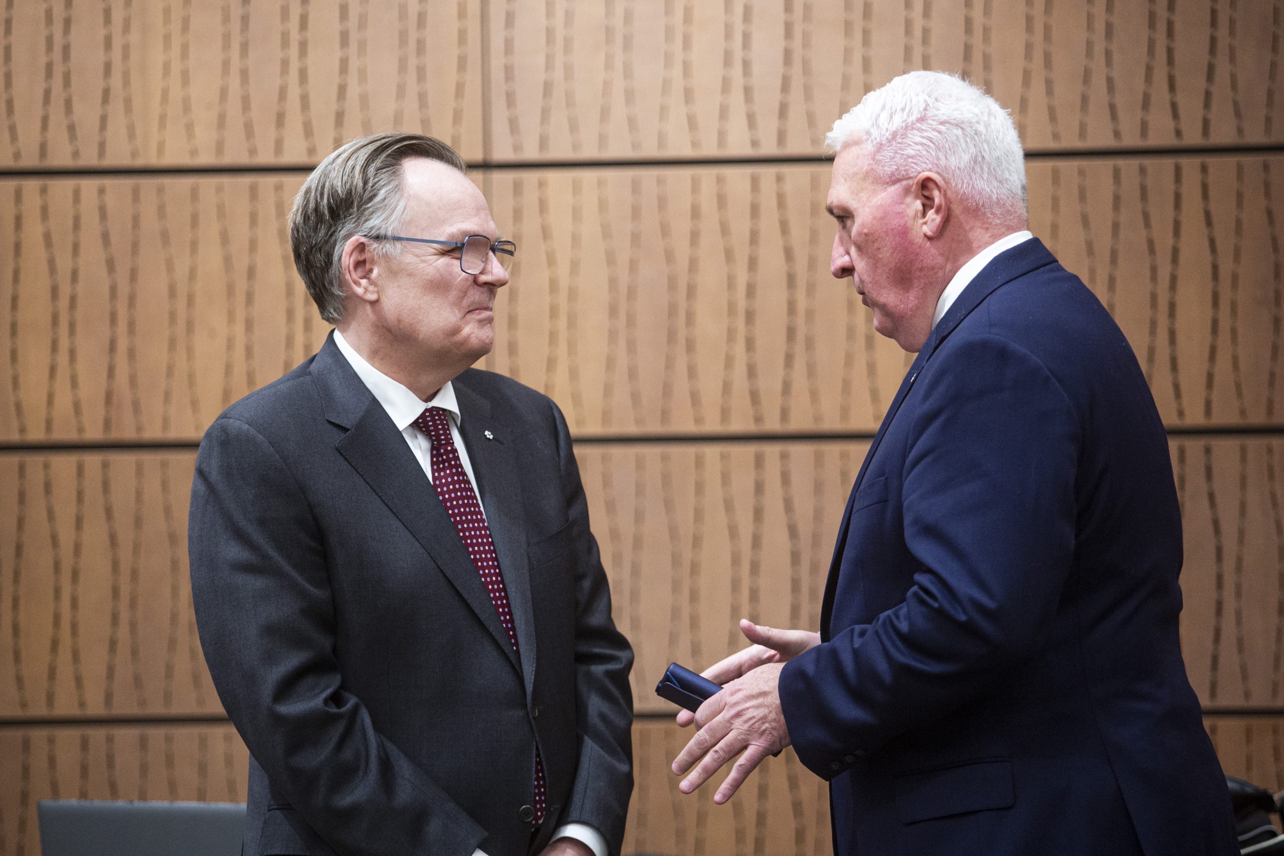 Marc-André Blanchard, chief of staff of the Prime Minister of Canada, speaks with committee chair Conservative MP John Brassard before the House of Commons Standing Committee on Access to Information, Privacy and Ethics on Nov. 20, 2025.