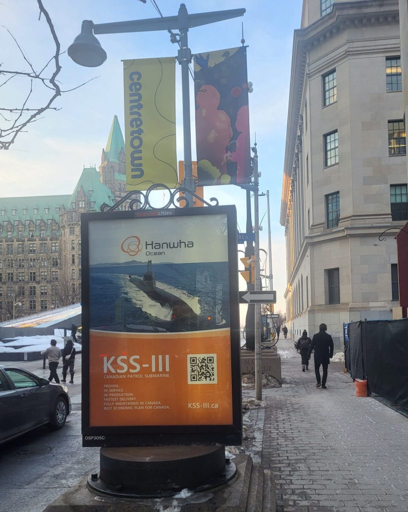 The Canadian Patrol Submarine Project (CPSP) aims to replace Canada’s aging fleet of Victoria III submarines. Hawnha is offering to deliver its KSS-III submarines to the Canadian Royal Navy on time, on budget, and serviced in Canada, according to advertisements across their social media pages and posters around downtown Ottawa.